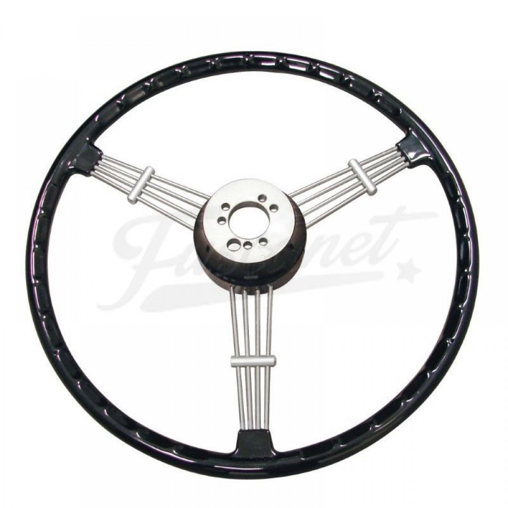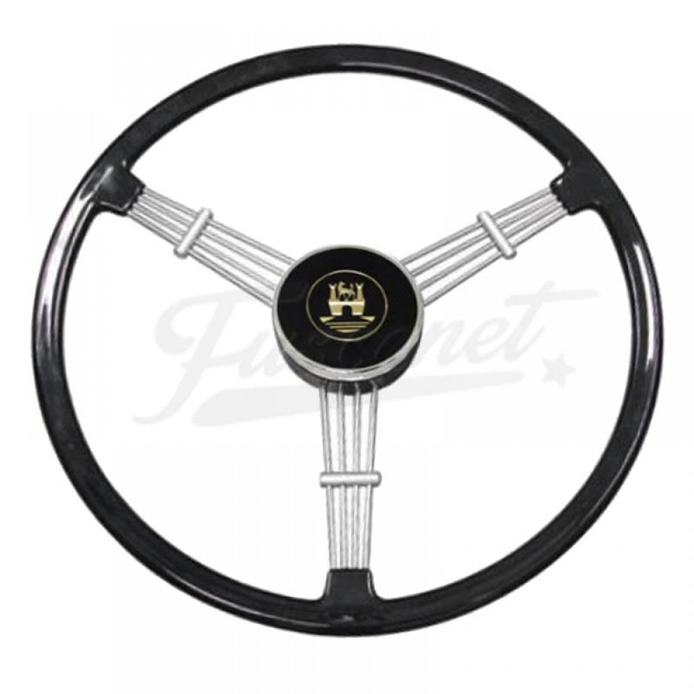 Volante vintage de 3 radios, estilo Banjo, de 390mm de diámetro. Cuenta con agarres para los dedos en la parte inferior y un aspecto retro. Se suministra con botón de bocina. Se debe comprar un kit de adaptador para completar la instalación.